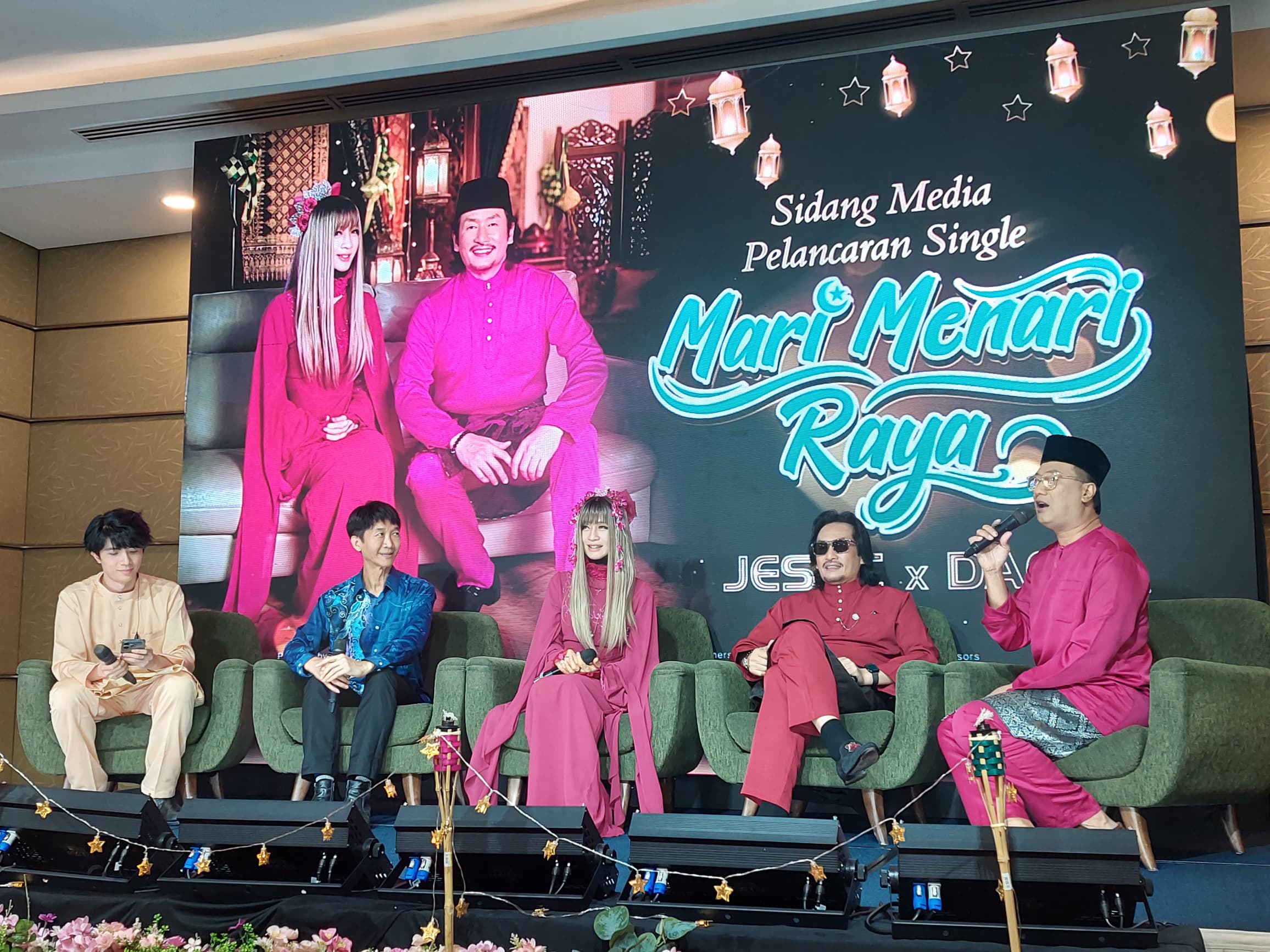 Datuk AC Mizal (kanan) dan JessC (kiri) bersedia menjawab soalan wartawan sempena sidang media pelancaran single dan muzik video lagu berjudul Mari Menari Raya di Kuala Lumpur malam tadi.
