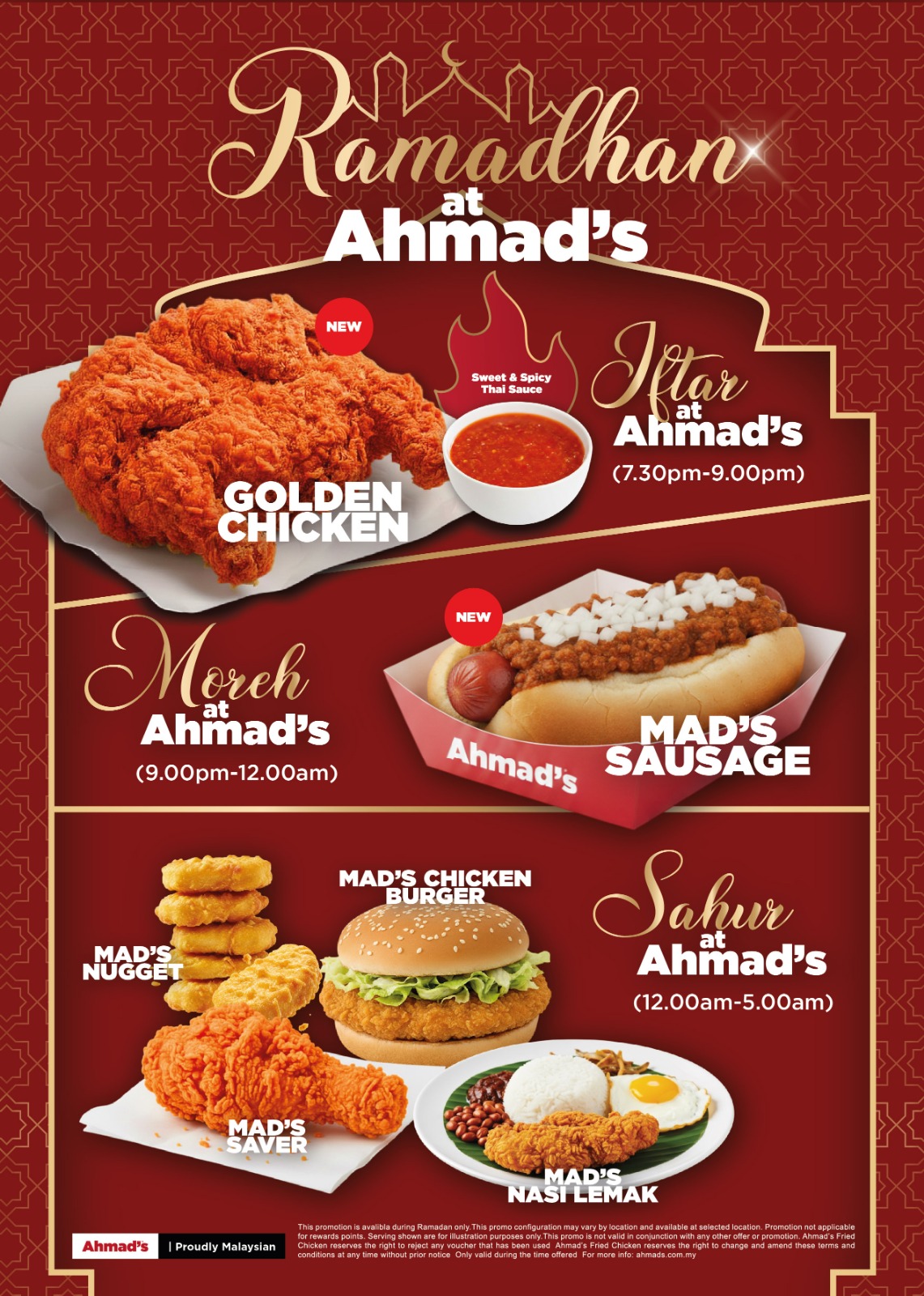 Bagi kategori Moreh, Ahmad’s memperkenalkan Mad’s Sausage dan minuman Lemon Cola yang menyegarkan. Manakala bagi segmen Sahur (bermula 12.00 tengah malam hingga 5.00 pagi), pelanggan ditawarkan menu ringkas namun mengenyangkan seperti Mad’s Nugget, Mad’s Chicken Burger, Mad’s Nasi Lemak, dan set jimat Mad’s Saver.