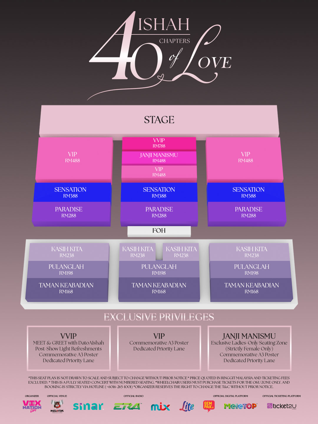 Harga tiket ditawarkan bermula daripada RM168 sehingga RM788 bagi kategori VVIP.