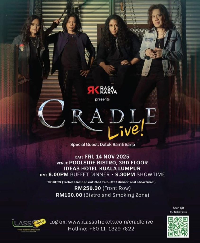 Kumpulan rock CRADLE bakal menghidupkan kembali semangat rock alternatif era 90-an menerusi Cradle Live!, sebuah persembahan intim dan eksklusif yang akan diadakan pada 14 November 2025 di Poolside Bistro, tingkat tiga, Ideas Hotel Kuala Lumpur.