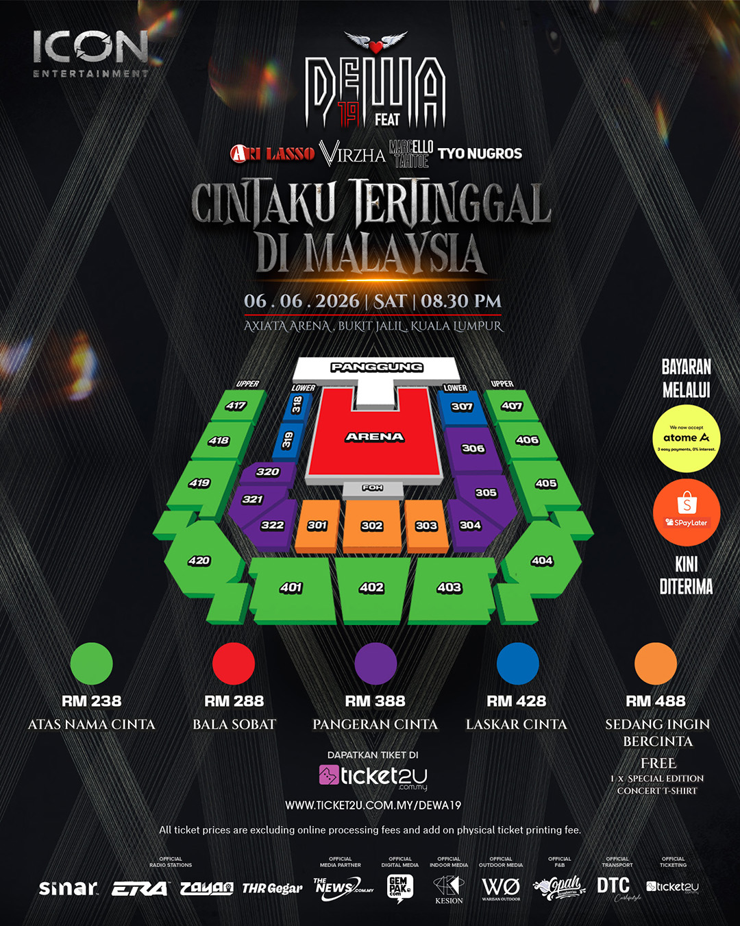 Bagi peminat yang tidak mahu ketinggalan menyaksikan momen bersejarah ini, tiket akan mula dijual pada Jumaat, 27 Februari 2026, bermula jam 11 pagi menerusi laman web www.ticket2u.com.my/dewa19 dengan harga bermula RM236 hingga RM488.