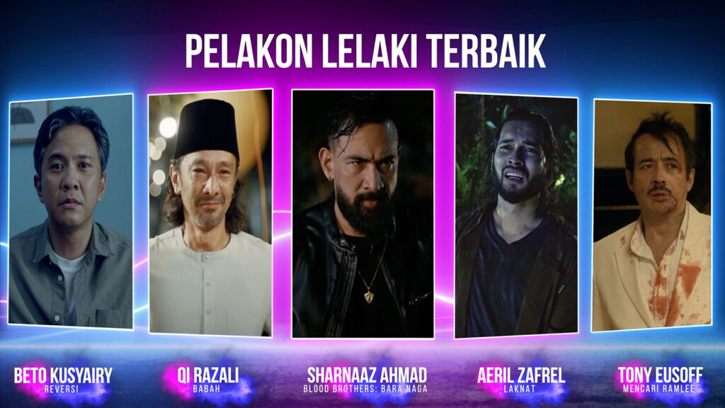 Lima calon utama untuk kategori Pelakon Lelaki Terbaik ialah Sharnaaz Ahmad (Blood Brothers: Bara Naga), Beto Kusyairy (Reversi), Qi Razali (Babah), Aeril Zafrel (Laknat) dan Tony Eusoff (Mencari Ramlee).
