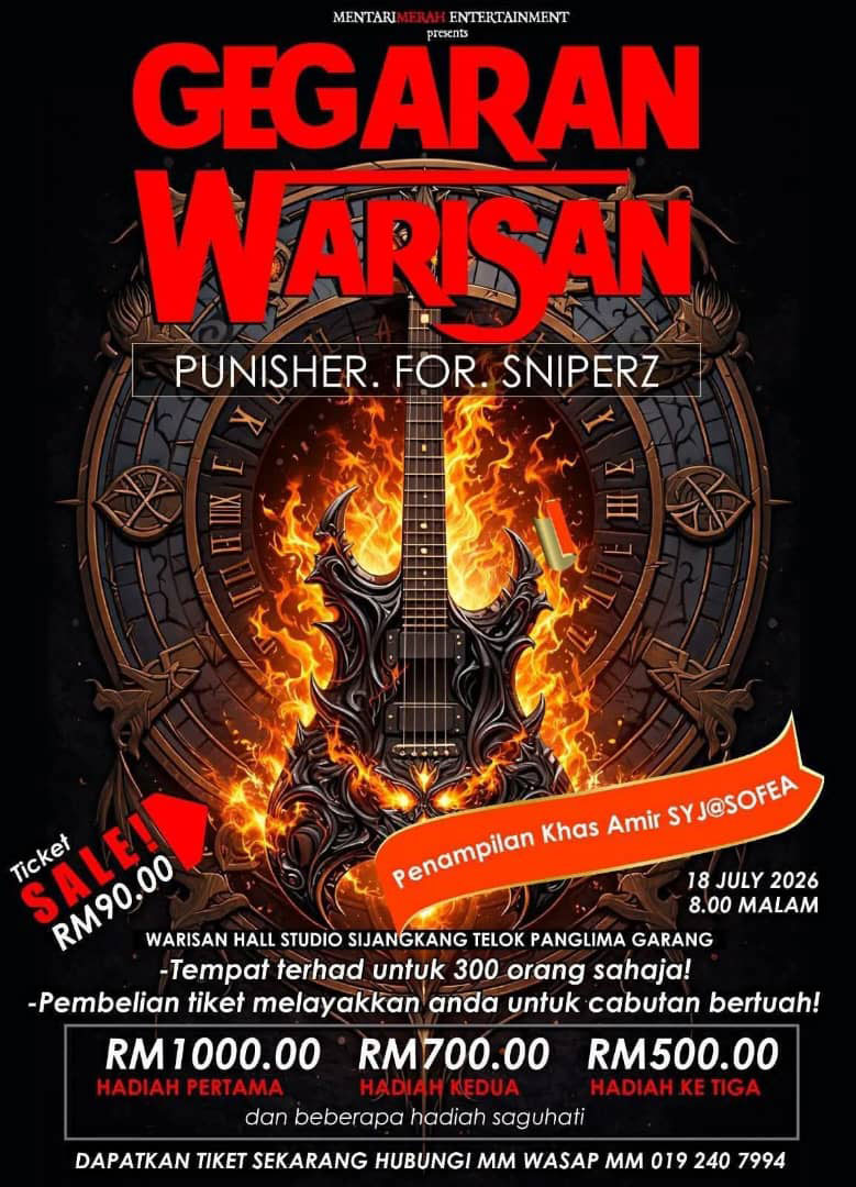 Demam muzik keras bakal melanda pinggir bandar apabila tiga nama besar dalam genre rock dan metal tempatan, Punisher, FOR, dan Sniperz, disahkan bakal berkongsi pentas dalam konsert Gegaran Warisan pada 18 Julai depan.