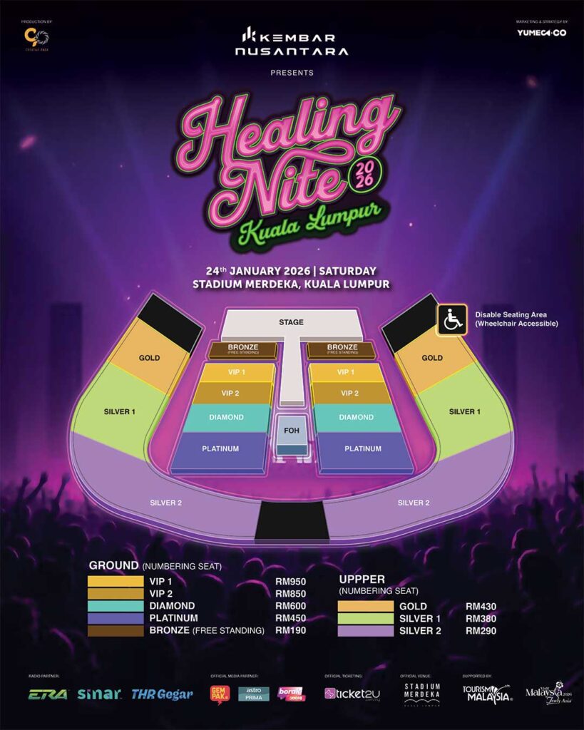 Mengangkat konsep healing atau pemulihan diri yang semakin mendapat perhatian masyarakat dunia, penganjuran konsert berskala besar Healing Night 2026 bakal menyatukan lima penghibur ternama dari Malaysia dan Indonesia di bawah satu pentas di Stadium Merdeka, Kuala Lumpur pada 24 Januari 2026.