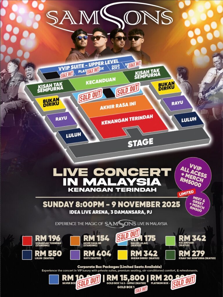 Bagi mereka yang mahu menikmati pengalaman paling eksklusif, pakej VVIP All Access + Merch (RM5,000) masih tersedia, termasuk Meet & Greet bersama Samsons, barangan eksklusif serta tempat duduk premium.