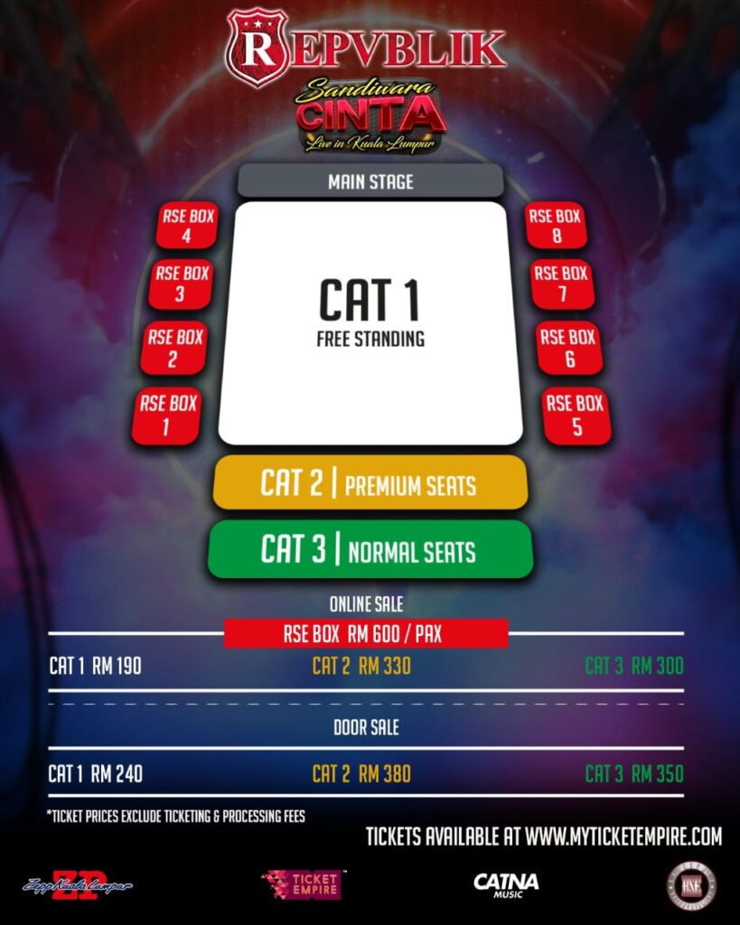 Harga tiket ditawarkan antara RM190 hingga RM600, merangkumi beberapa kategori tempat duduk daripada Normal Seats hingga RSE Box eksklusif. Tiket boleh didapati menerusi laman web rasmi https://www.myticketempire.com/repvbliksandiwaracintakl.