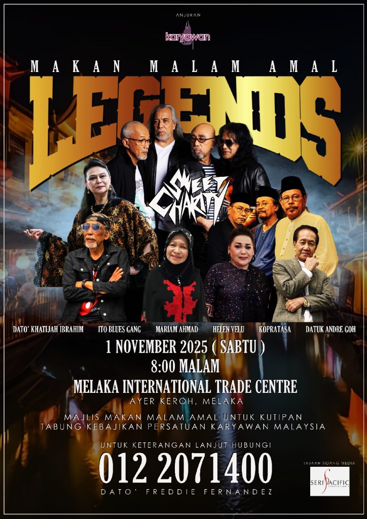 Majlis makan malam amal “Legends” anjuran Persatuan Karyawan Malaysia (KARYAWAN) bakal menjadi tumpuan apabila menghimpunkan artis-artis legenda tanah air seperti Sweet Charity, Kopratasa, Dato’ Khatijah Ibrahim, Ito Blues Gang, Datuk Andre Goh, S. Mariam dan Helen Vellu di Melaka International Convention Centre (MITC) pada 1 November 2025.