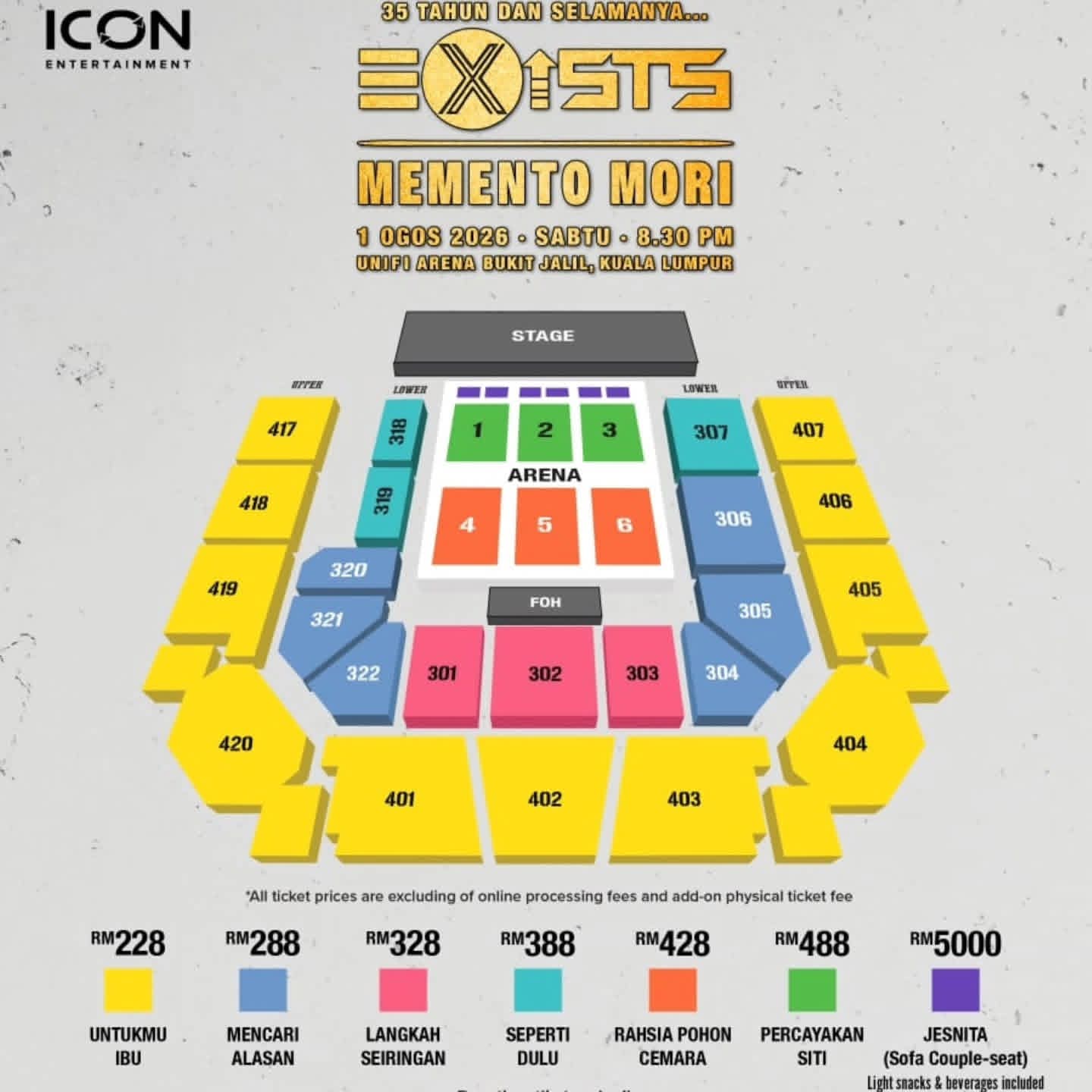 Harga tiket bermula RM288 dan akan mula dijual pada 30 April 2026, jam 11 pagi menerusi laman web www.ticket2u.com.my/ExistsMori.