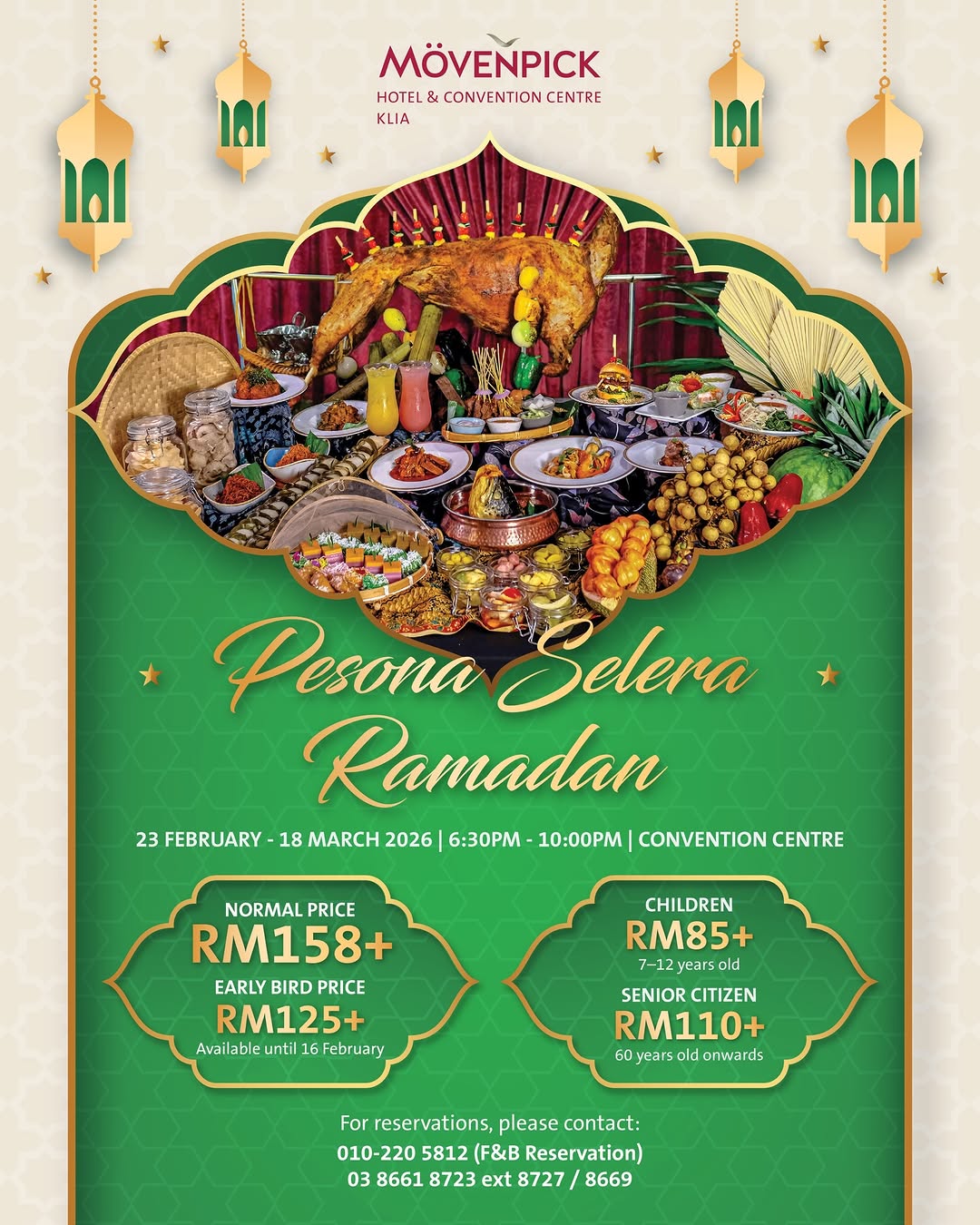 Dianjurkan di persekitaran hotel yang tenang dan jauh dari hiruk-pikuk kota, bufet ini berlangsung setiap hari bermula 23 Februari sehingga 18 March 2026, dari jam 6.30 petang hingga 10.00 malam di Pusat Konvensyen Mövenpick KLIA.