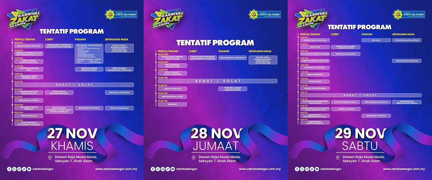 Lembaga Zakat Selangor (LZS) kembali menganjurkan Karnival Zakat Selangor 2025 selama tiga hari bermula 27 hingga 29 November ini di Dewan Raja Muda Musa, Seksyen 7, Shah Alam, dengan pelbagai pengisian merangkumi peluang kerjaya, pameran interaktif serta aktiviti kekeluargaan.
