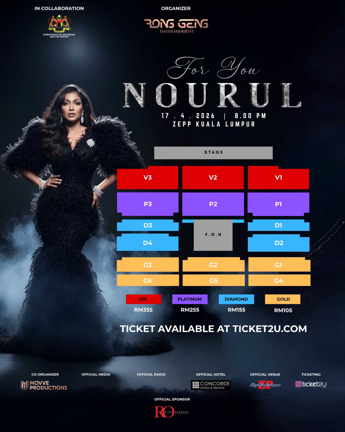 Tiket untuk menyaksikan Konsert For You: Nourul mula dijual hari ini (2 Disember 2025), bermula jam 12:00 tengah hari di platform rasmi ticket2u, dengan harga serendah RM105 (GOLD) hingga RM355 (VIP).