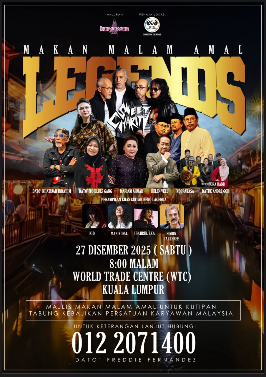 Pentas Putra World Trade Centre (PWTC) bakal digegarkan dengan persembahan istimewa daripada barisan pemuzik dan gitaris lagenda tanah air dalam acara ‘Makan Malam Amal Legends’ pada 27 Disember 2025 (Sabtu), jam 8:00 malam.
