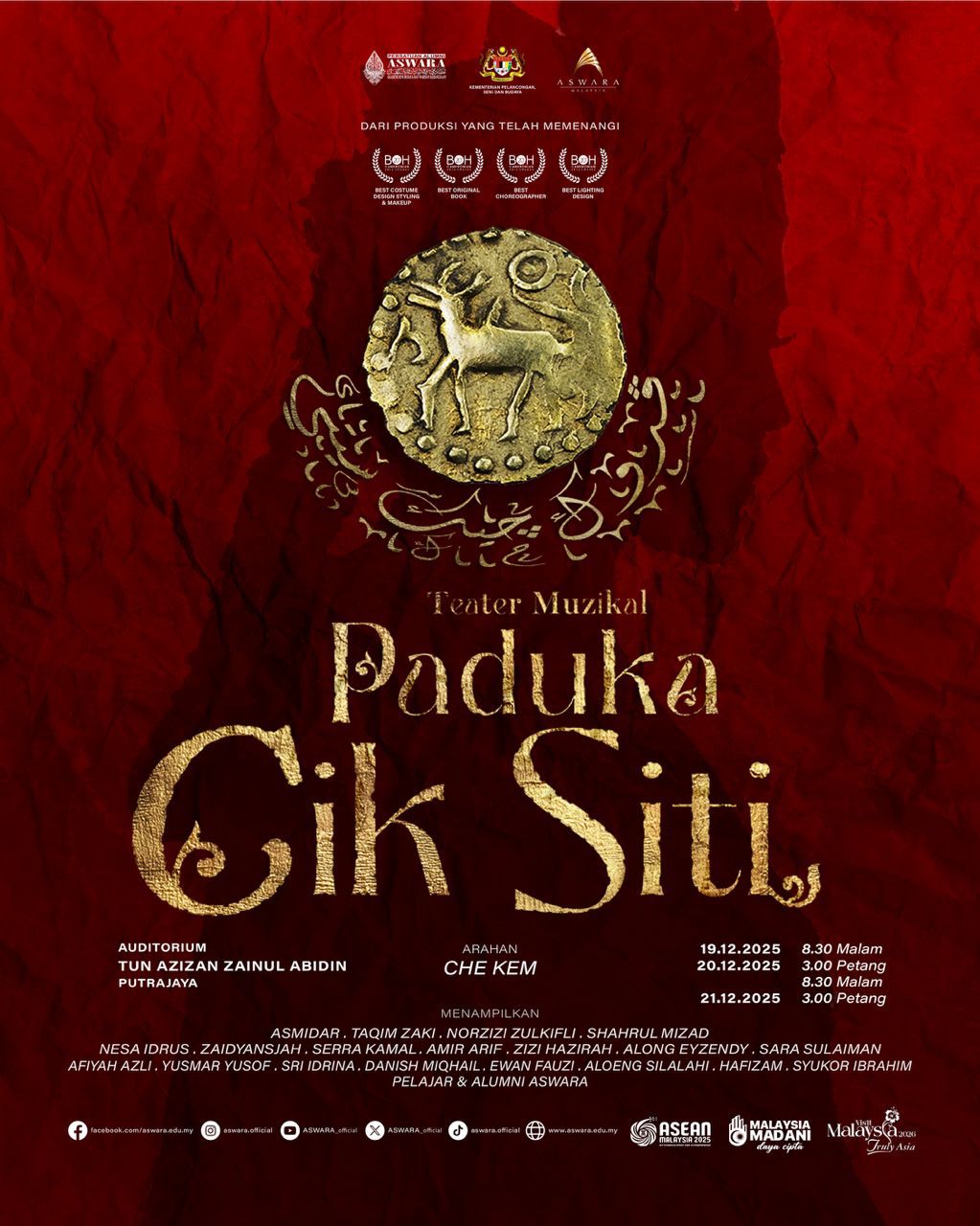 Akademi Seni Budaya dan Warisan Kebangsaan (ASWARA) dengan kerjasama erat Persatuan Alumni ASWARA kini kembali menggegarkan persada seni negara dengan sebuah naskhah muzikal baharu, Teater Muzikal Paduka Cik Siti, yang menjanjikan persembahan berskala besar dan berimpak tinggi.