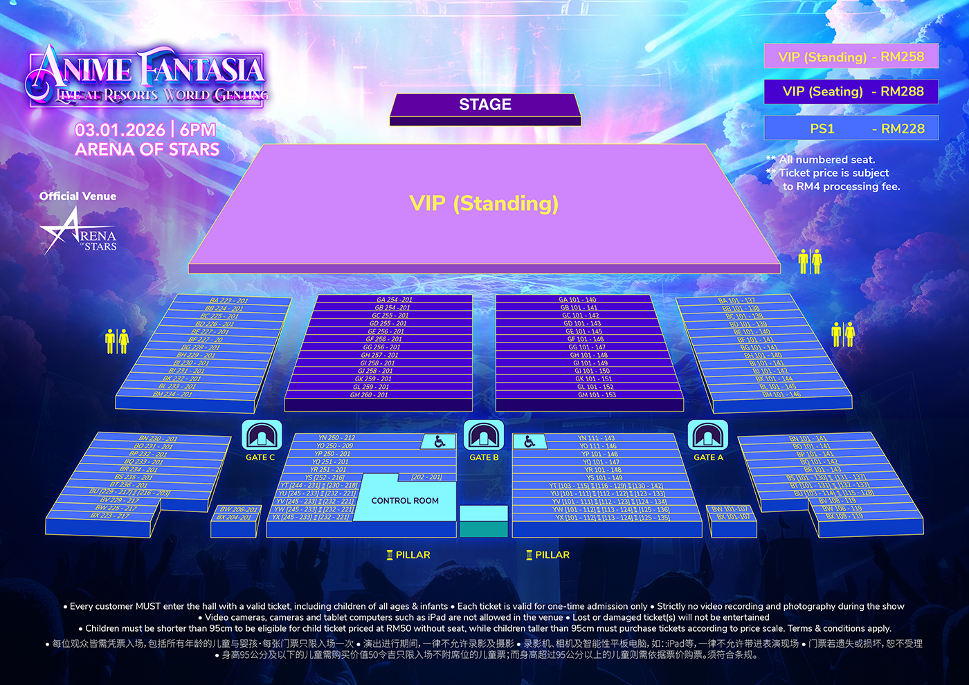 Tiket konsert berharga RM258 (VIP/Zon Berdiri), RM288 (VIP/Zon Tempat Duduk), dan RM228 (PS1), tidak termasuk caj pemprosesan RM4. Jualan umum akan dibuka pada 2 Disember 2025, jam 12 tengah hari, di mana ahli GRC Gold dan ke atas boleh menikmati diskaun eksklusif 10% bagi semua kategori.