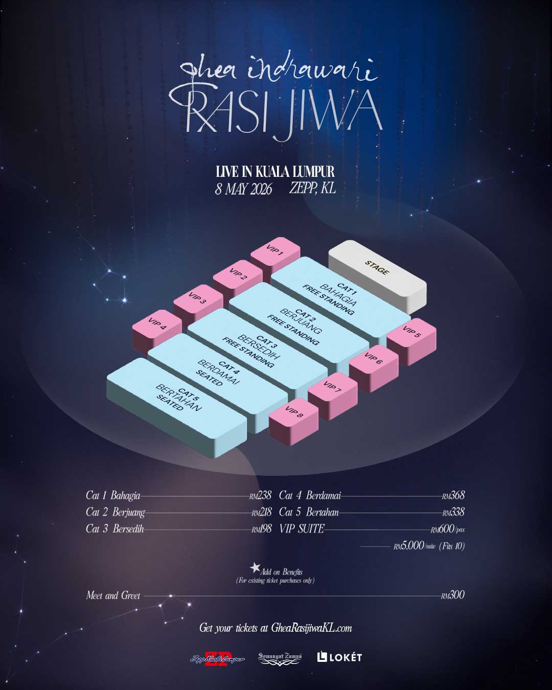 Peminat boleh mendapatkan tiket menerusi laman web rasmi https://GheaRasiJiwaKL.com atau platform jualan tiket LOKET.