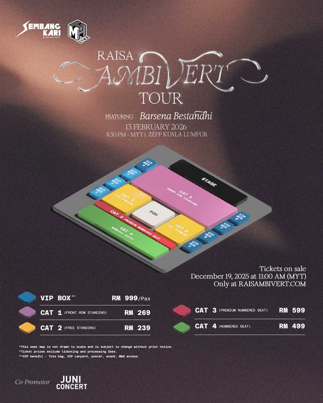 Bagi pemegang tiket kategori VIP BOX, mereka bakal menikmati keistimewaan eksklusif termasuk sesi ramah mesra (Meet & Greet) bersama Raisa, barangan rasmi, lanyard, dan poster.