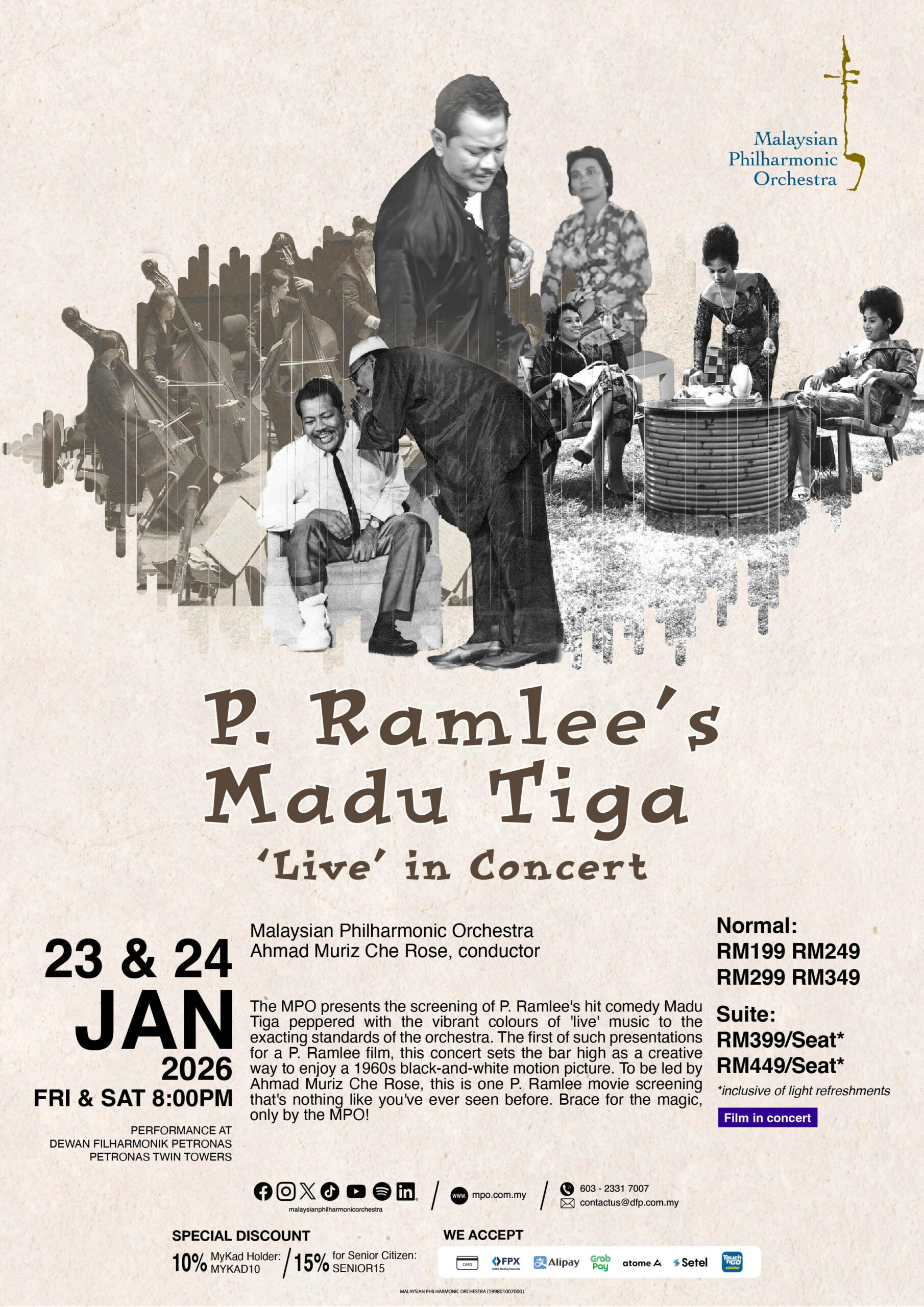 Demam ‘Madu Tiga’ kembali melanda ibu kota apabila karya agung seniman agung, Allahyarham Tan Sri P. Ramlee itu bakal dihidupkan semula dalam dimensi luar biasa oleh Orkestra Filharmonik Malaysia (MPO) di Dewan Filharmonik PETRONAS (DFP), KLCC bermula malam ini.
