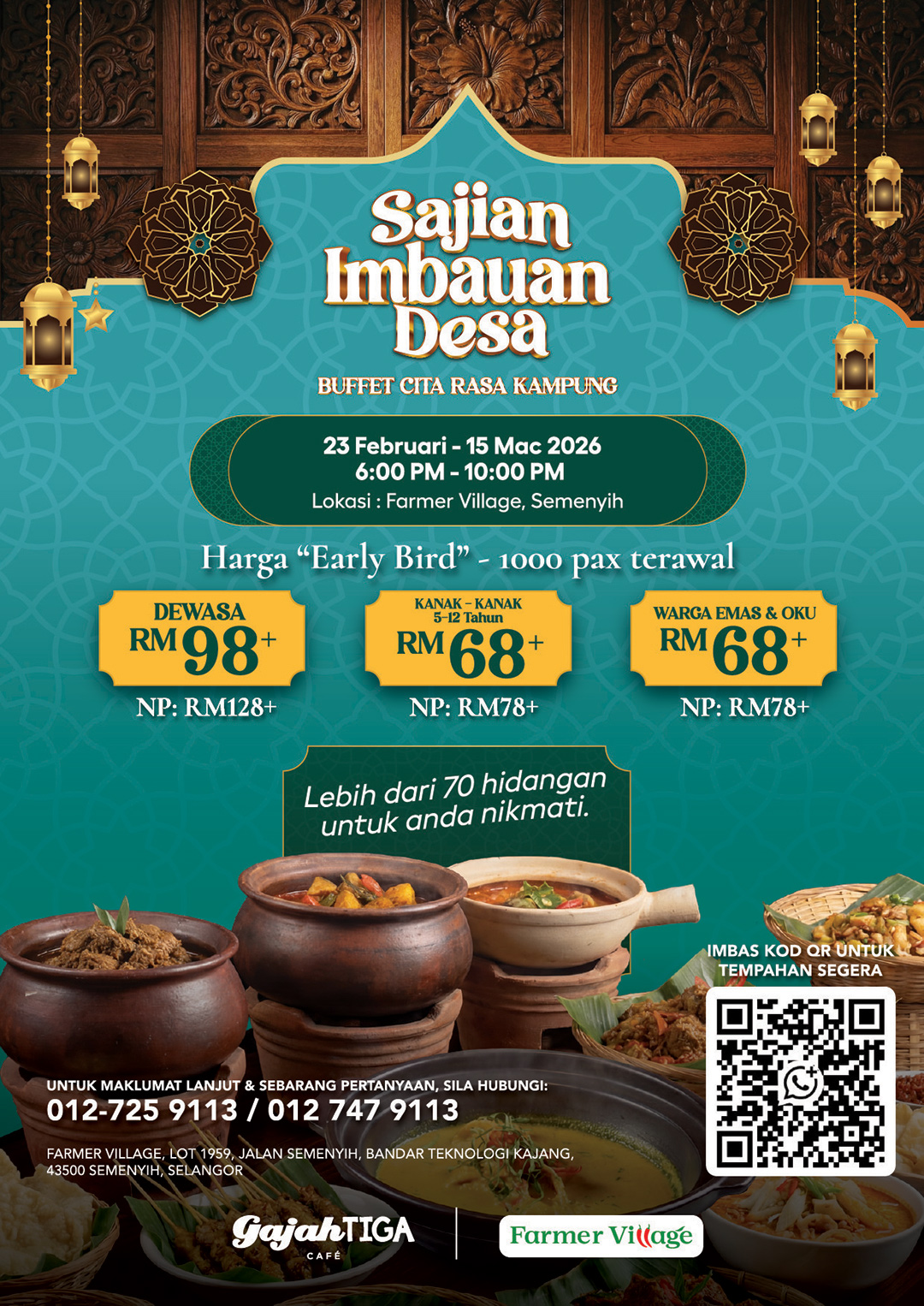 Buffet Ramadan Sajian Imbauan Desa ini akan bermula pada 23 Februari 2026. Harga ditawarkan bermula dari RM78 hingga RM128, namun 1,000 pelanggan terawal berpeluang menikmati harga ‘early bird’ serendah RM68 hingga RM98.