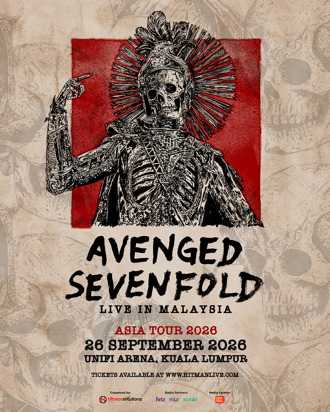 Kumpulan ikonik yang mempelopori genre metal moden itu mengesahkan Kuala Lumpur sebagai salah satu destinasi utama dalam siri Jelajah Asia 2026 mereka menerusi konsert yang diberi nama ‘Avenged Sevenfold Live in Malaysia’.