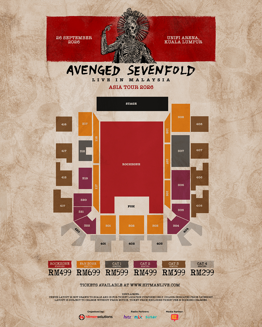 Harga tiket ditawarkan mengikut lima kategori tempat duduk bermula dari RM299 sehingga RM699, manakala kategori berdiri Rockzone dijual pada harga RM499.
