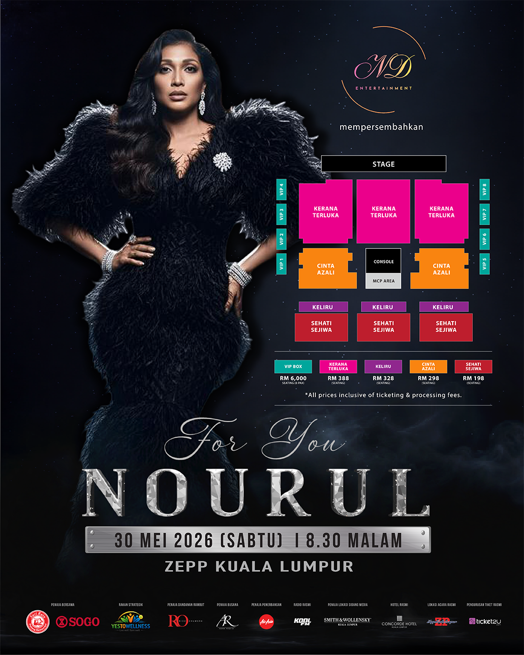 Jualan tiket kepada orang ramai akan dibuka bermula 1 April 2026, jam 11:00 pagi menerusi laman web rasmi penganjur. Harga tiket bermula dari RM168 sehingga RM638, tertakluk kepada yuran pemprosesan dan SST.