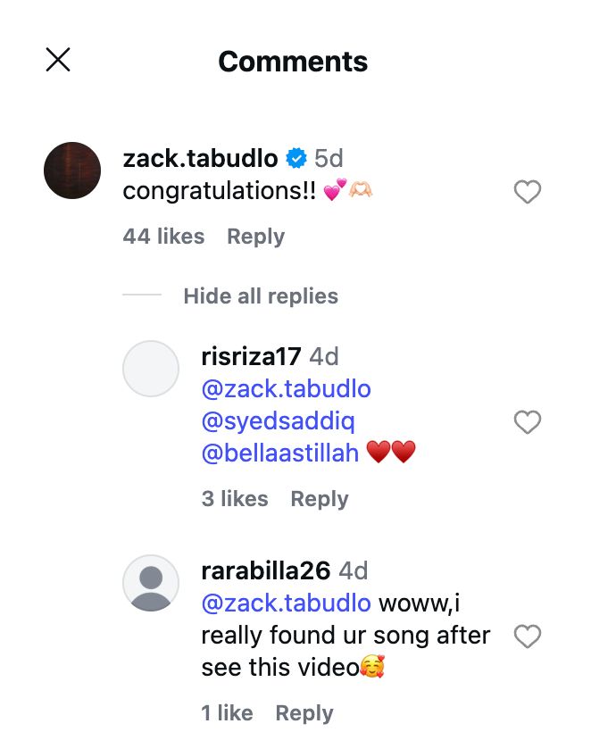 Menariknya, Zack Tabudlo sendiri turut menyedari gelombang tular tersebut dan sempat menitipkan ucapan tahniah kepada Bella dan Syed Saddiq menerusi ruangan komen di Instagram, yang seterusnya menambah keterujaan pengikut kedua-dua pihak.