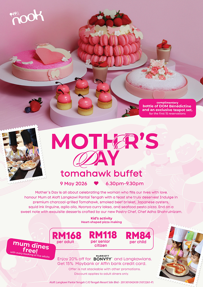 Menghargai kasih sayang dan pengorbanan seorang insan bergelar ibu, Aloft Langkawi Pantai Tengah menganjurkan promosi eksklusif Mother’s Day Tomahawk Buffet Dinner yang bakal berlangsung pada 9 Mei ini.