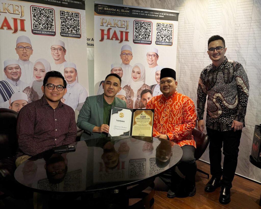 Dari kiri: Pengarah Urusan Jay Ibrahim Travel & Tours Sdn. Bhd., Hariz Radzi; Duta PJH Jay Ibrahim Travel & Tours Sdn. Bhd, Hafiz Hamidun; dan Pengasas merangkap Presiden Jay Ibrahim Travel & Tours Sdn. Bhd., Jay Ibrahim.