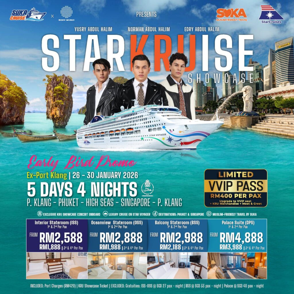 Legenda muzik tersohor tanah air, KRU, bakal berlayar bersama peminat dalam pelayaran mewah STAR KRUise Showcase, satu pengalaman muzik eksklusif selama lima hari empat malam di atas kapal Star Voyager Cruise (SVO) yang dijadualkan pada Januari 2026.