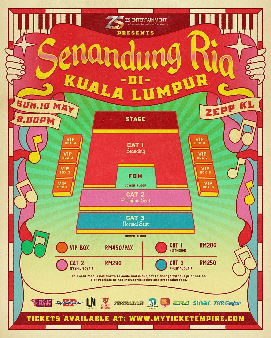 Konsert ‘Senandung Ria Di Kuala Lumpur’ dianjurkan bersama Lampuneon Entertainment selaku promoter rasmi dengan tawaran harga tiket bermula RM200 sehingga RM450.